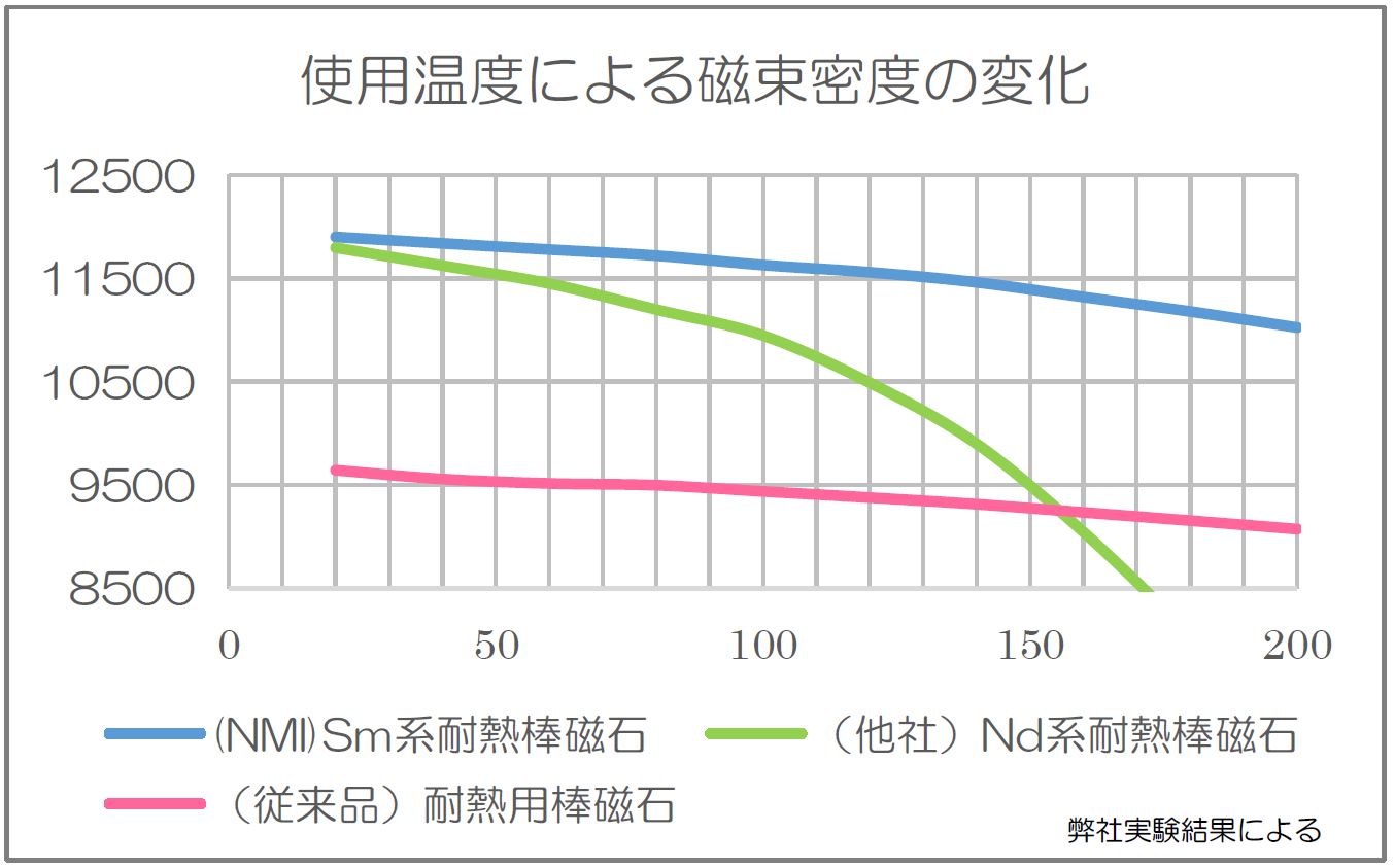 それに対し、Sm 系の耐熱棒磁石は磁力の低下が少ないというメリットがあります。